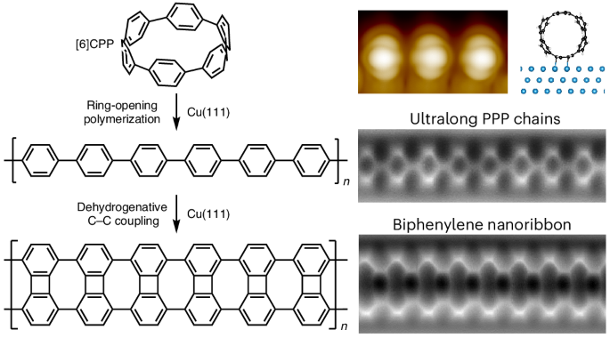Poly(para-phenylene) chains can be synthesized by surface-assisted Ullmann coupling, but the step-growth mechanism limits elongation beyond ~100 nm. Now poly(para-phenylene) chains in the micrometre range have been obtained by an on-surface radical ring-openi… more…